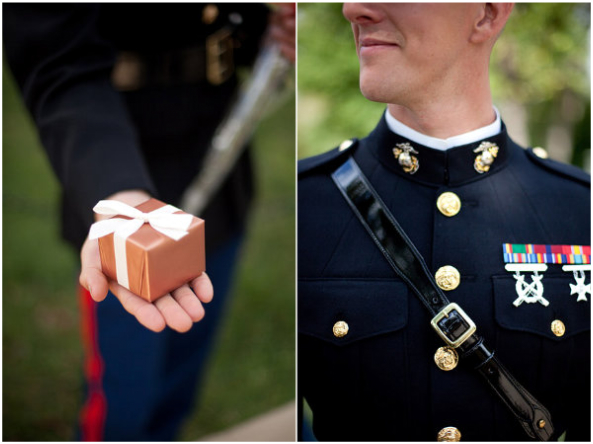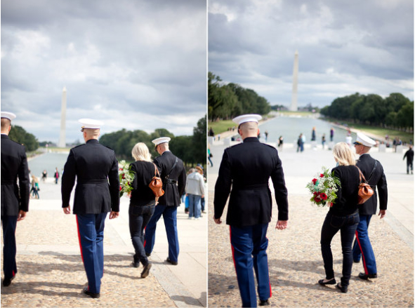 Just had to share this amazing engagement story, mainly because it involves two people who are dear to us; Joe and Jill. Joe is a marine and Jill is a physical therapist! He organized this most elaborate treasure hunt for Jill sending her to different locations throughout the D.C area each with a Marine in dress blues with a single rose and a question she had to answer! The last rose led her to Joe at the Lincoln memorial accompanied by all the handsome marines in their dress blues which of course drew a crowd. That’s where the question was finally asked, “Will you marry me?” Oh and he hired a photographer (Michelle Cross) to capture it all, what a guy.