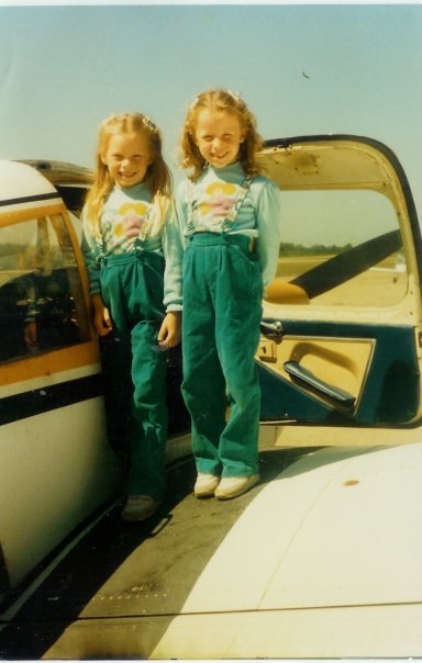On top of our Dad’s airplane, stylin and profilin in our cabbage patch tops paired with pleated turquoise cords….thank you, Mom