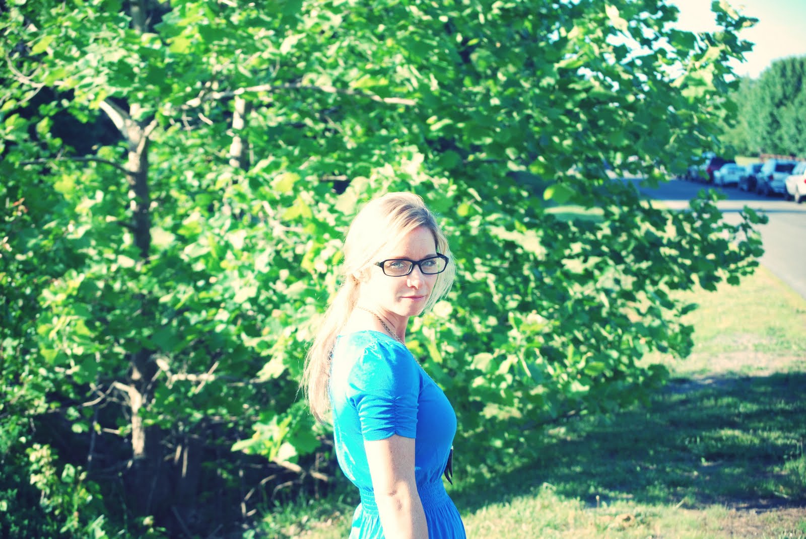 I'm not even looking at the glasses, I'm loving the shoes and that cute blue dress!