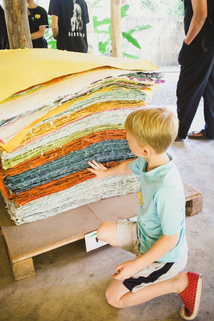 We hired a Grab car (they are the nicest cars/ super reliable) from our hotel for the day to get to the Elephant Poo Poo Park and Sticky waterfalls (Bua Tong waterfalls). The drive was long and bumpy so if your kiddos get carsick, heads up! I cannot express enough of how worth it the Elephant Poo poo park is….the place is so organized, beautifully landscaped, and done well. Call to reserve a slot, they take you through a short tour which is super engaging for the kids, then let every person make a craft from the elephant poo paper. We opted out of an elephant park for a couple reasons, we have been to Thailand previously and visited the elephants-the experience was not good. This was 12 years ago when every park was allowing you to ride them and it kinda scarred me, they whipped the elephants the whole time and they were super skinny. I think it’s amazing how they have addressed this overall and made changes in Thailand to focus on protection, but after reading this article I decided to still wave off since it was pricey, far from our hotel, and would take an entire day. The elephant poo poo park was a good alternative option for us! Following the poo poo park, I asked the girl at the desk of a lunch recommendation and boy did she come through, theres a place right next door with great food and incredible mountain views, called Rabieng Na Maerim. The restaurant in- house kittens really entertained my boys, such a treat. Last stop of the day was the sticky falls. DO NOT miss this. It was worth the long windy ride, in fact I wish we made more time for it, the park closes at 5pm. The waterfalls have limestone minerals deposited on the rocks so you can actually climb up the waterfall like spiderman. Your children will literally think they are superheroes. Do note, the darker rocks are still slippery so still proceed with caution!