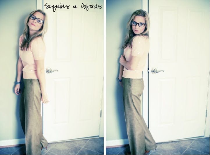 So here we go, first up, sequins and oxfords. Sequins and I go way back, like as in dance recitals since I was 5, it was love then and love now! The top is a pale/pink sweater with clear sequins and on bottown my potato sack pants, really they feel exactly like burlap but lined. {From Okinawa and pefectly hemmed, love Japan!) And the glasses, well that’s just me trying to look smart! The oxford shoes I got for Christmas this past year, still going strong!