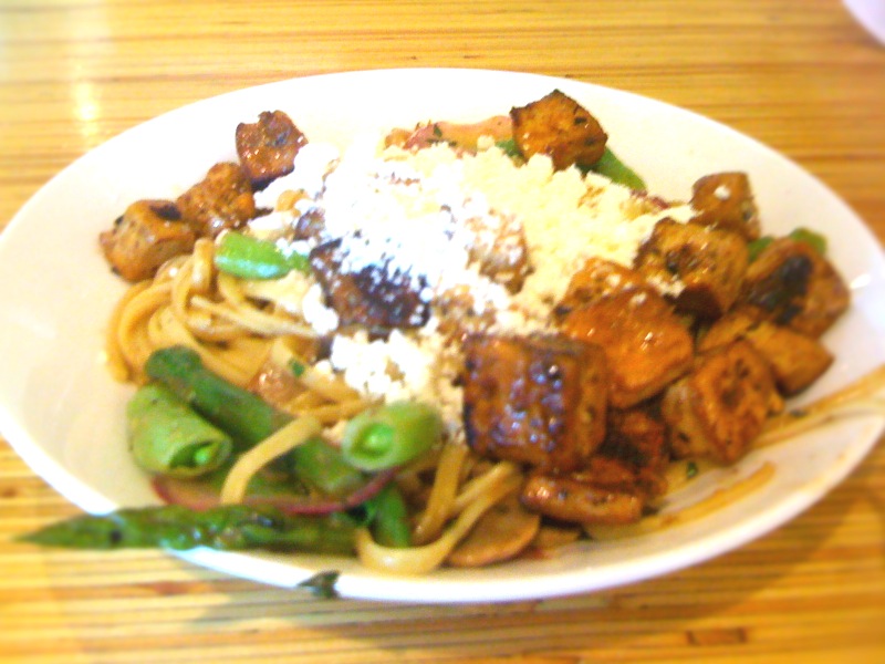 Lemon asparagus linguine with sugar snap peas, basil, mushrooms, feta, and tofu.